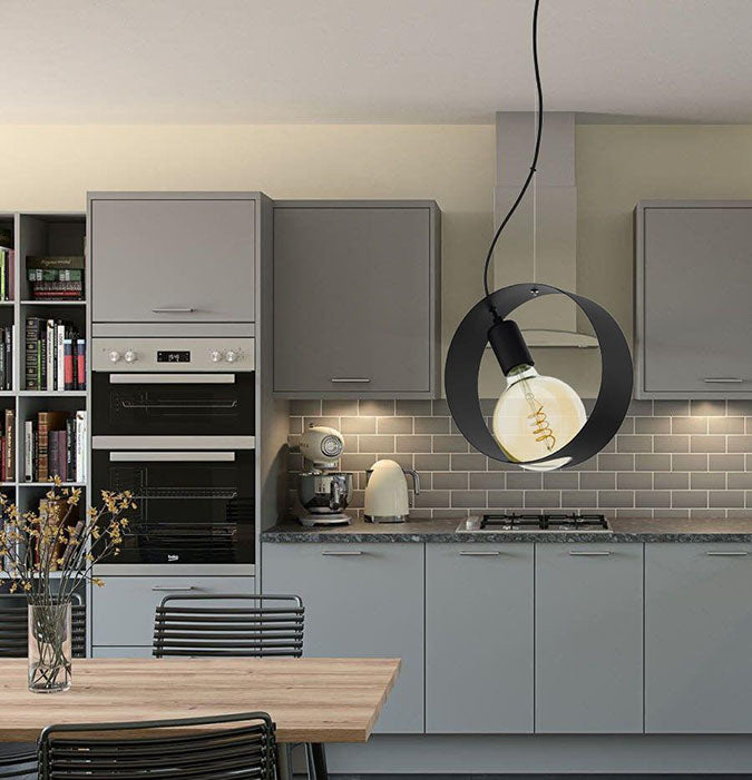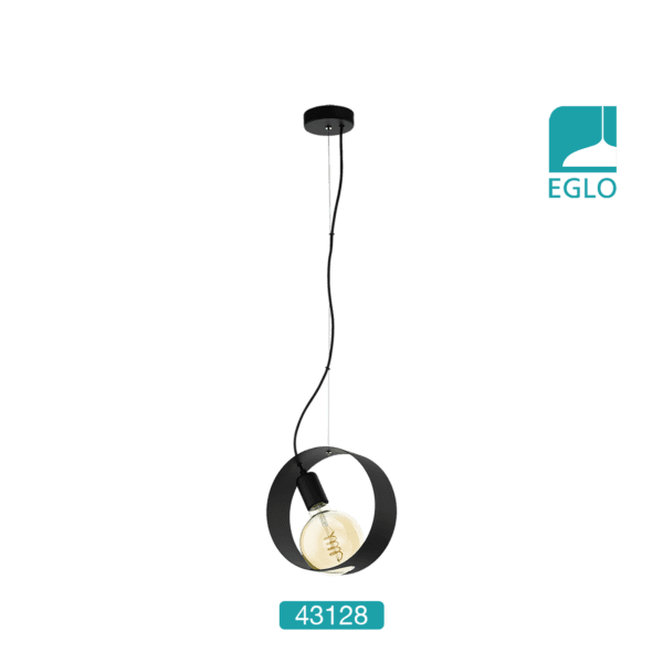 This Eglo Maidenhead 1 light ceiling pendant is finished in black steel and is suspended from the ceiling on a black cord. The steel shade is tilted in design with the lamp sitting beautifully on the underside of the ring.