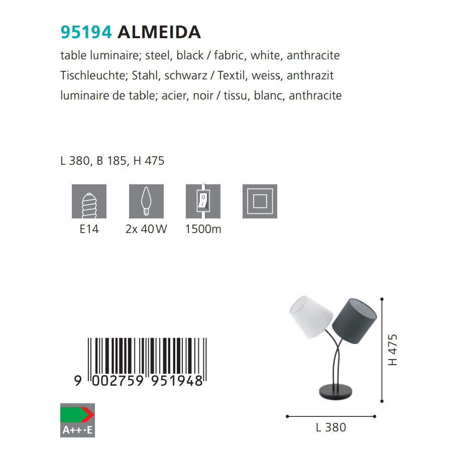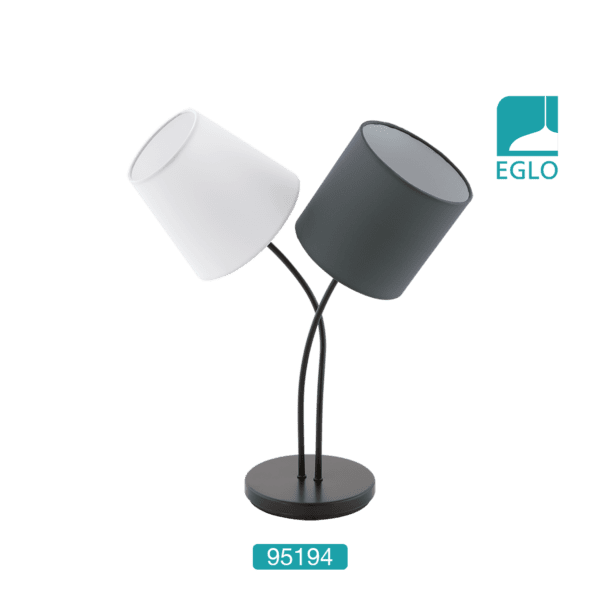 This EGLO Almeida two light table lamp is finished in black and comes complete with one white and one anthracite fabric shade. This striking light would make an lovely addition to any room.