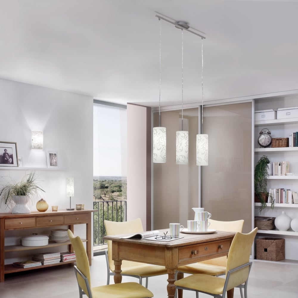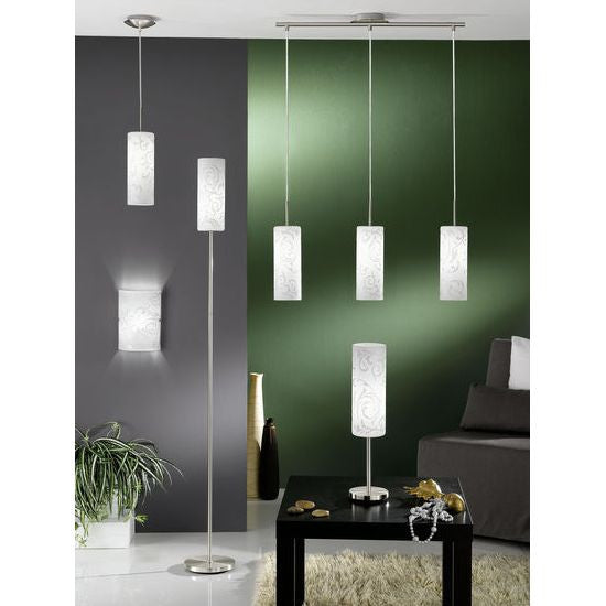 AMADORA 90048 A modern ceiling light finished in matt nickel, with patterned white glasses.