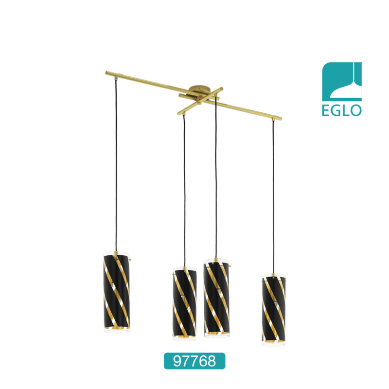 This Pinto Gold four light ceiling pendant light is finished in black and gold glass and is suspended on a black cable. The light is hung in a cross shape, which is simply beautiful. The stripes are stunning to look at, making this light a striking addition to any room.