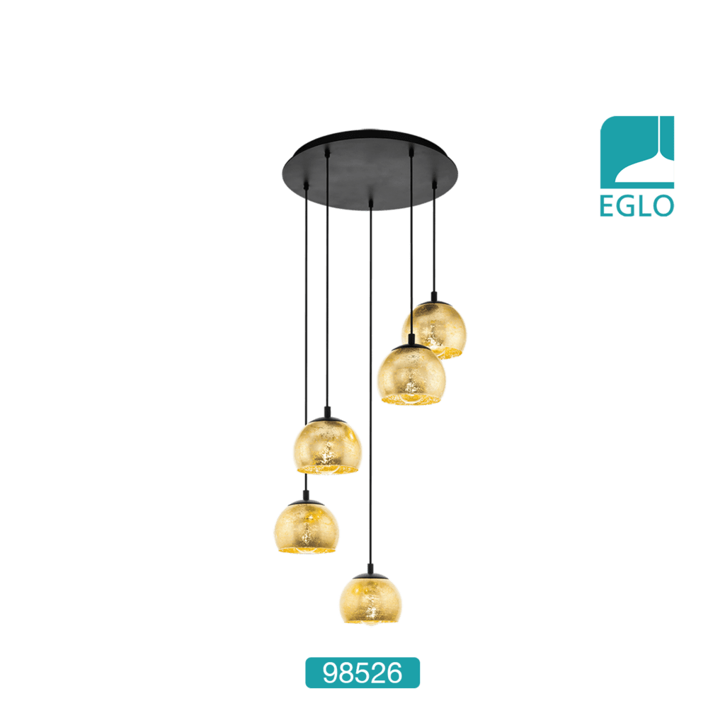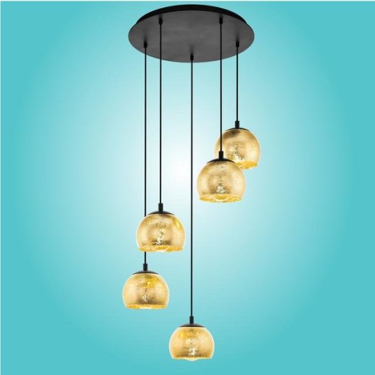5 light cluster ceiling pendant features is a circular ceiling plate in black finish holding 5 open globe shaped, gold colored, glass shades suspended at different heights.