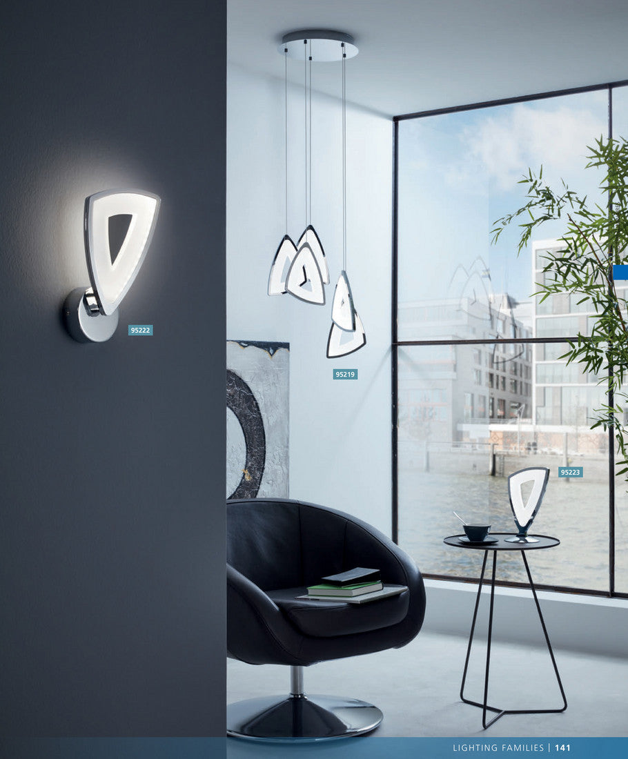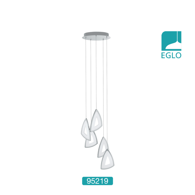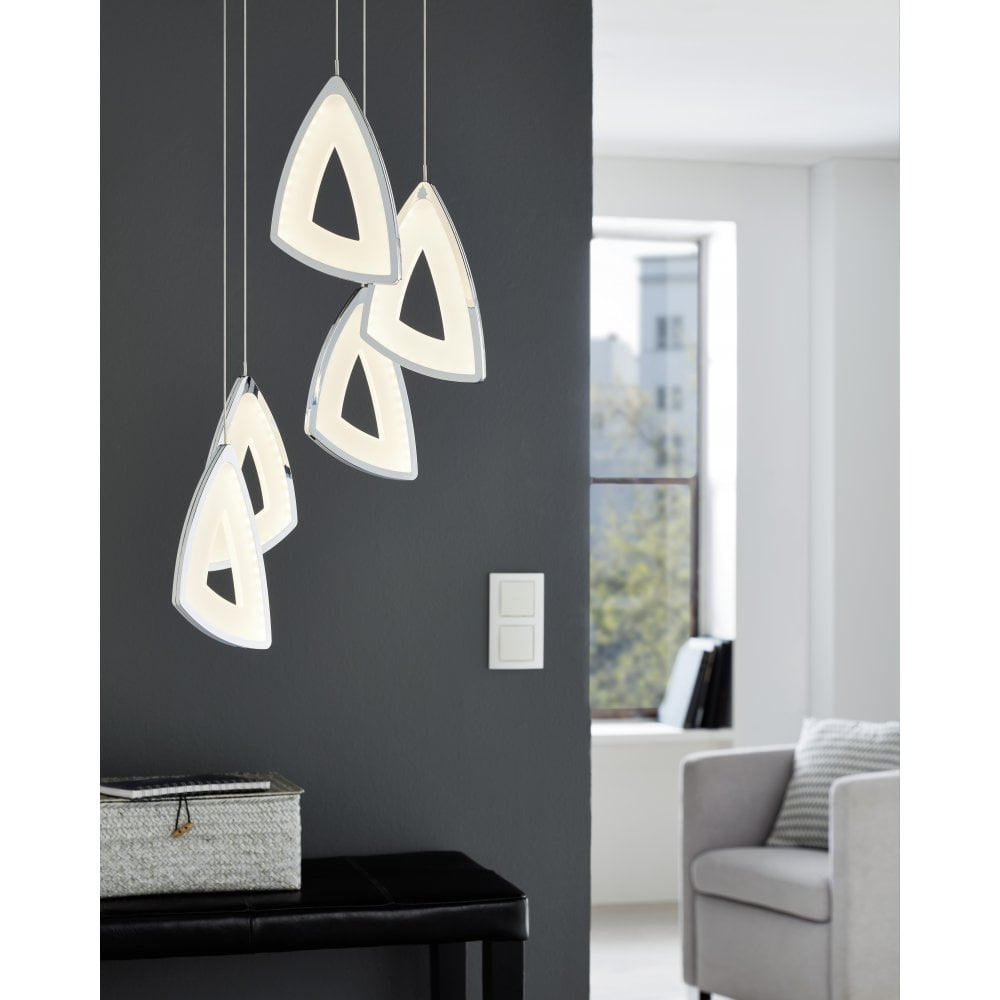 This EGLO Amonde five light LED ceiling pendant light is finished in chrome and comes complete with white satinated plastic. The five lights are suspended at different heights and are triangular in design. This light would make a stunning addition to any room.