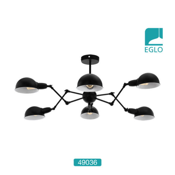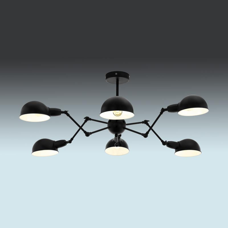 This EGLO Exmoor six light semi flush atomic sputnik ceiling light is finished in black and comes complete with black metal shades. This striking light resembles a spider, with the legs extending from the main body of the light. The hinged arms, mean the lights can be directed as required, making this an incredible centerpiece in any room.