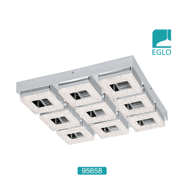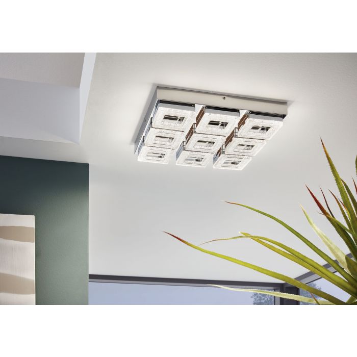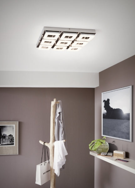 This EGLO Fradelo square LED wall/ceiling light is finished in chrome and crystal and can be hung on either the wall or the ceiling. This striking light is available in a number of sizes and this one has a length of 440mm (please see website for alternatives). The chrome casing supports the squares of crystals, making it a stunning addition to any room.
