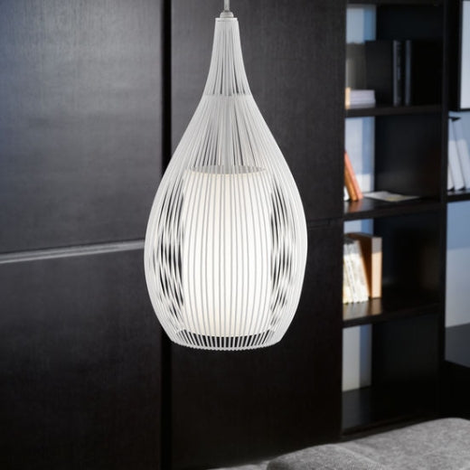 This Eglo Razoni one light ceiling pendant light is finished in white and is suspended on a white cable from a ceiling plate. The teardrop style shade is a cage design and there is a white inner cylinder concealing the bulb. This stunning light is unusual in appearance and would make a striking addition to any room.