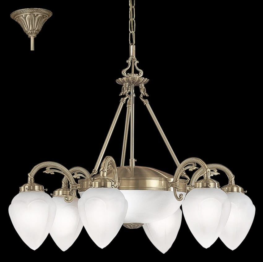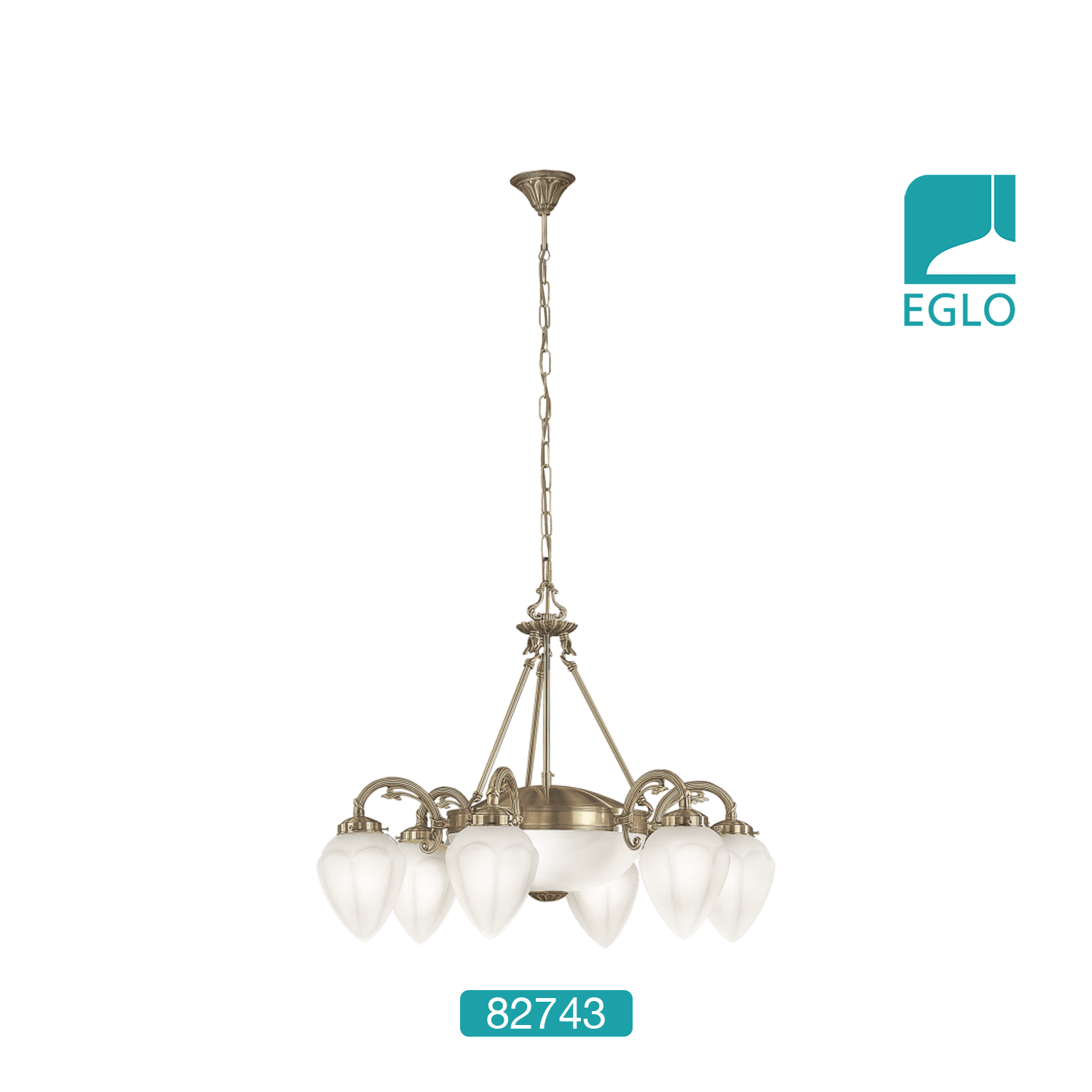 Bronzed Pendant Light, item code 82743. The Imperial 8 light traditional ceiling light pendant has a burnished brass finish and comes complete with white glass shades.