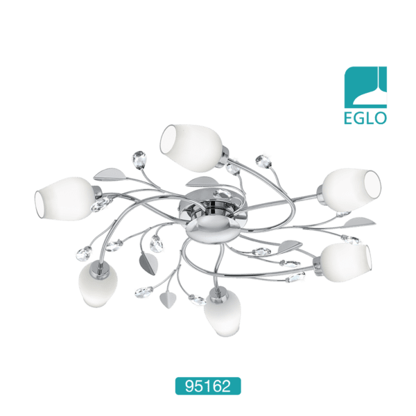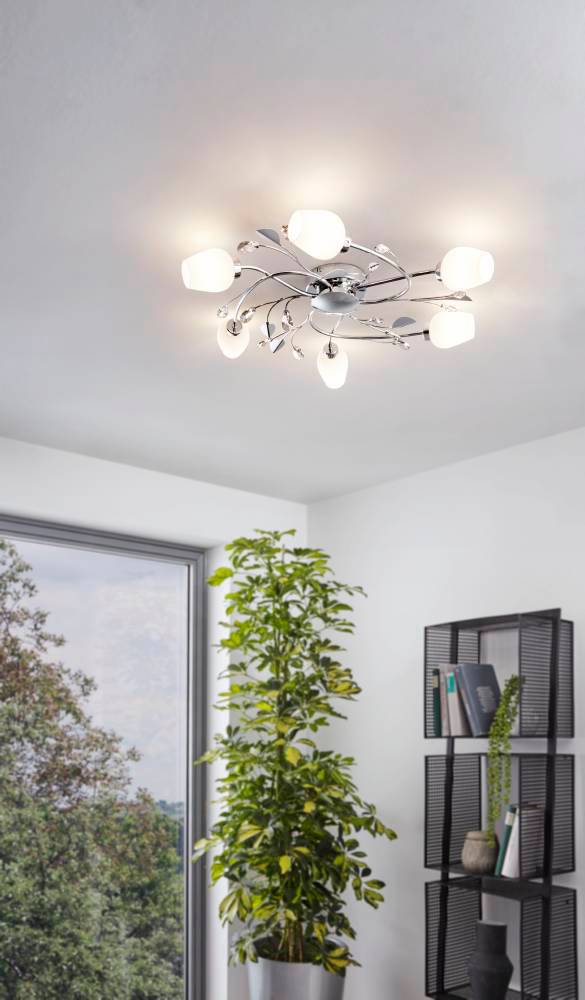 This EGLO Pitale six light ceiling light is finished in chrome and has white satin glass shades. Complete with high quality glass crystals, this light would make a stunning addition to any room.