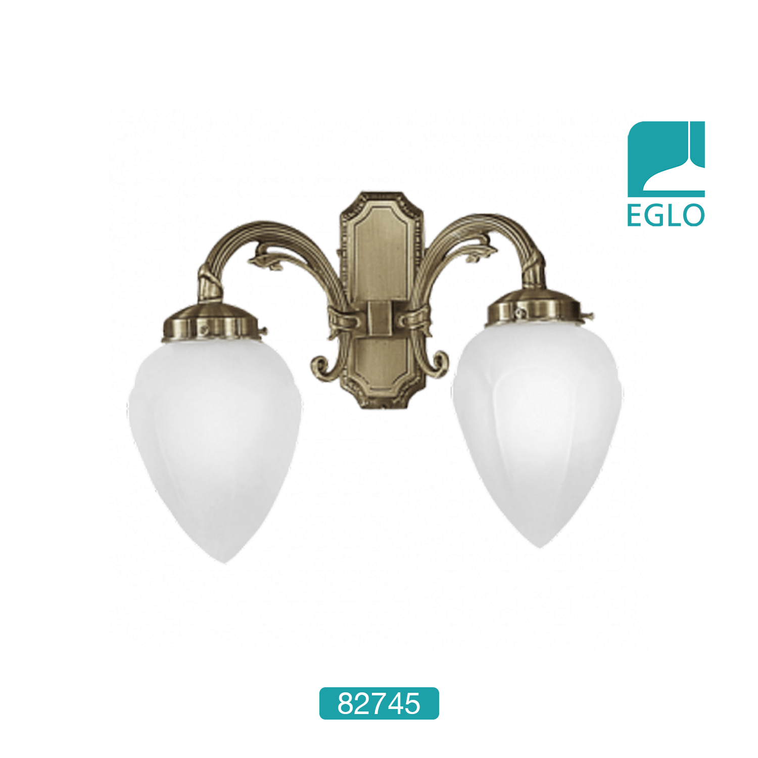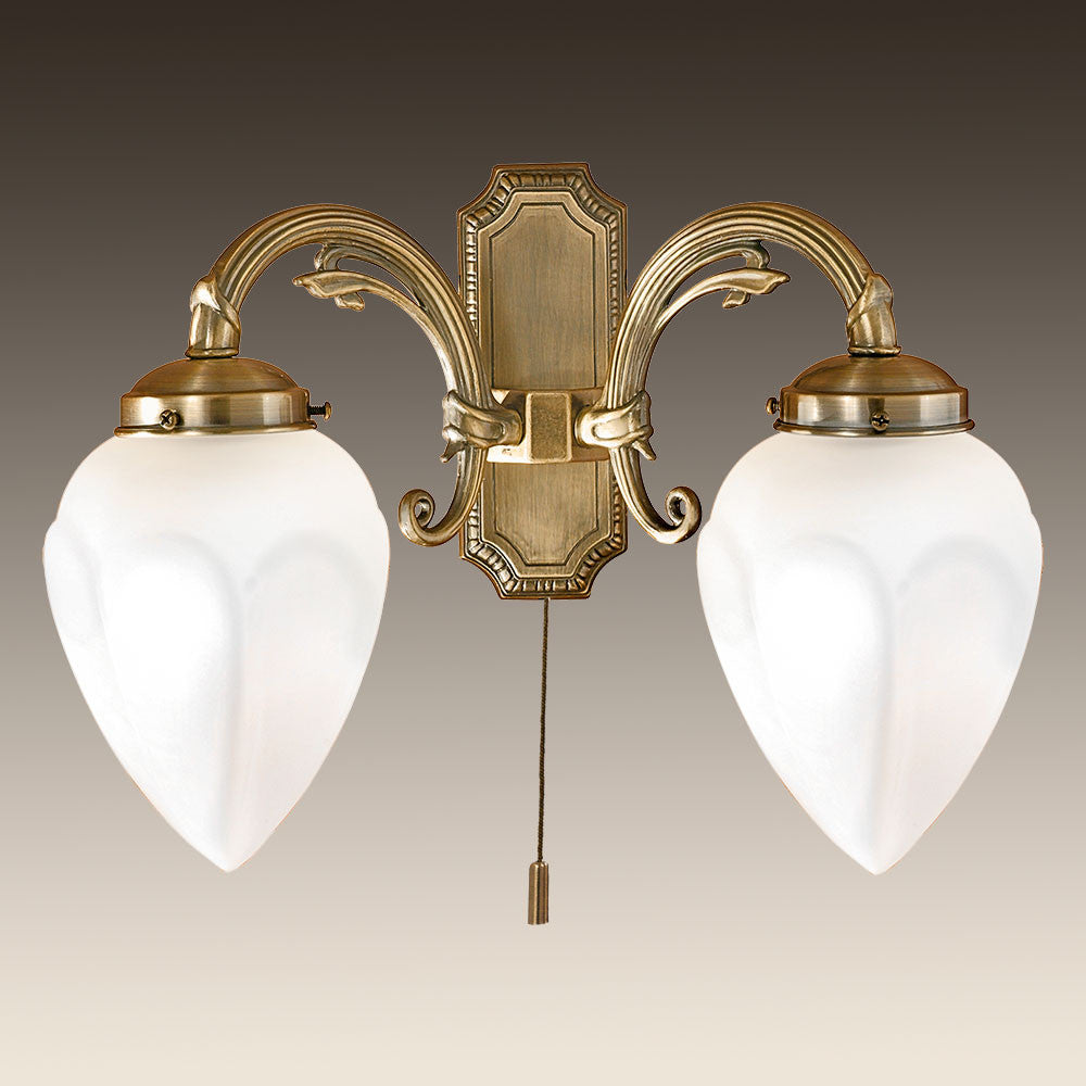 Classic Wall Light, item code 82745. The Imperial 2 light traditional wall light has a burnished brass finish and comes complete with white glass shade. It has a switch to turn the light on and off with.