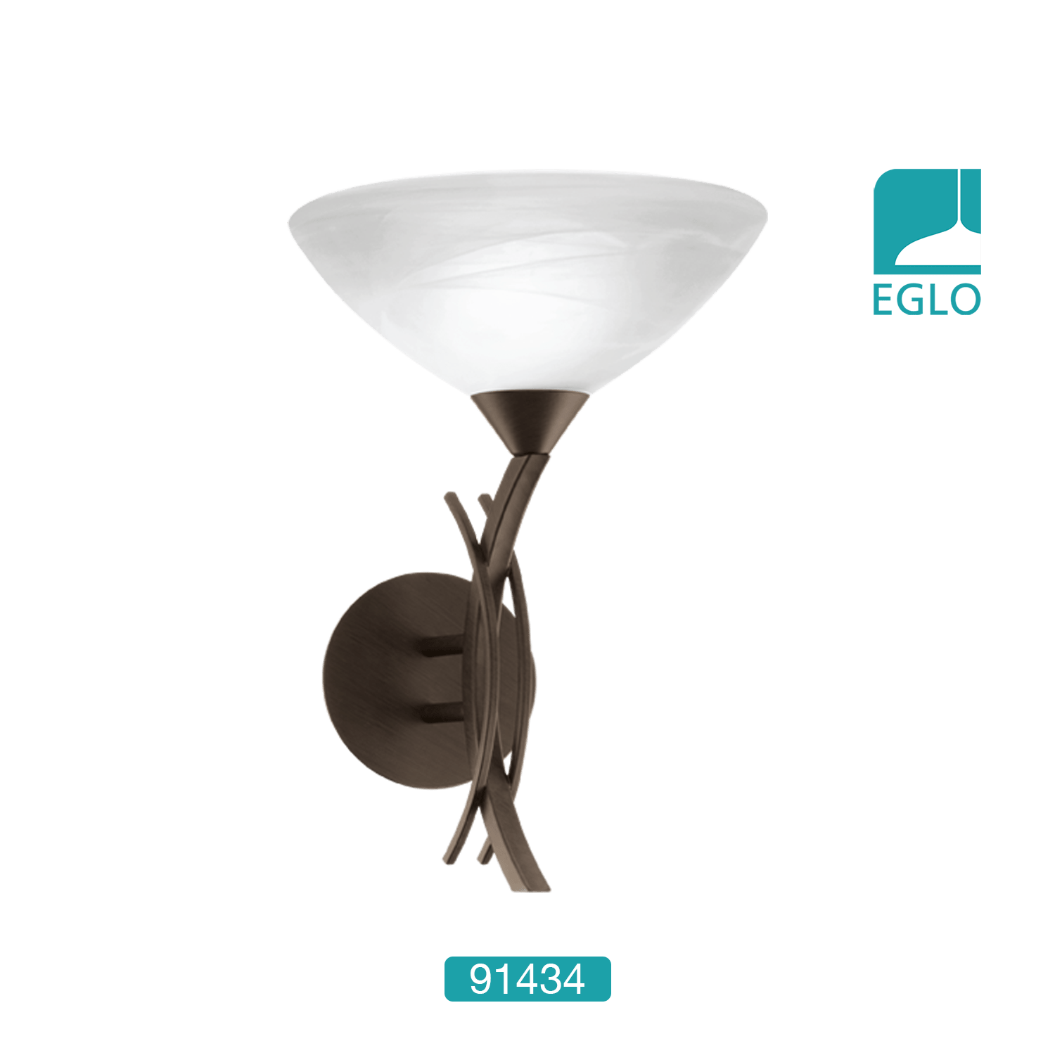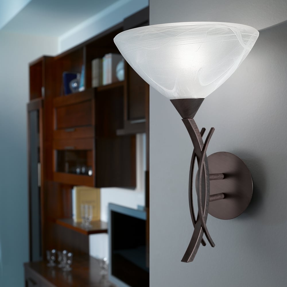 This Eglo Vinovo one light wall light is finished in dark brown and comes complete with an alabaster white glass shade.ï¾ The curved ironwork ensures this unusual light is unique in design and would make a striking addition to any room.