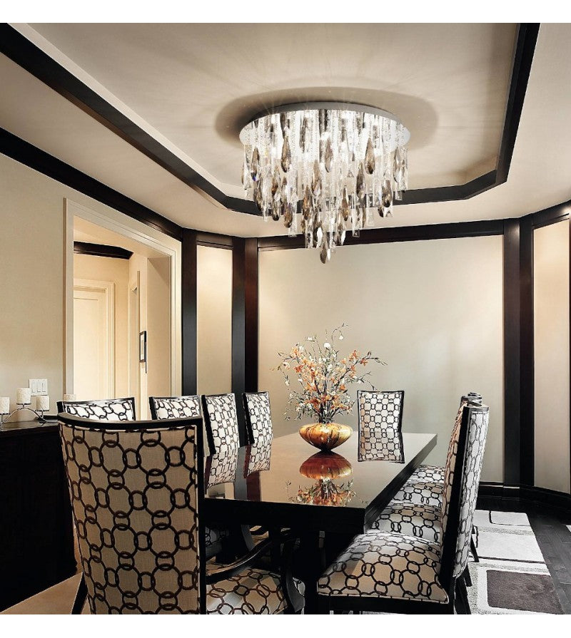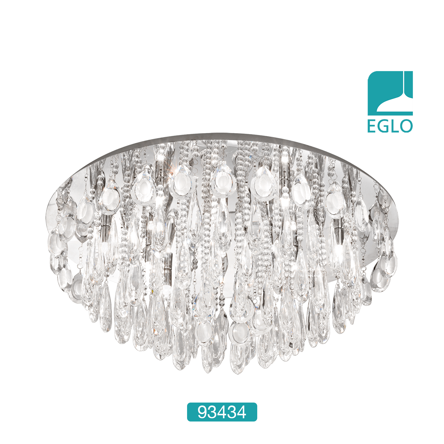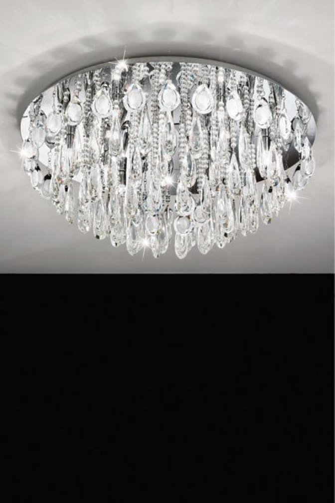 The Eglo Calaonda 10 Light Round Flush Ceiling Light is in a Chrome finish, dressed with sparkling crystal drops in a variety of shapes and sizes.