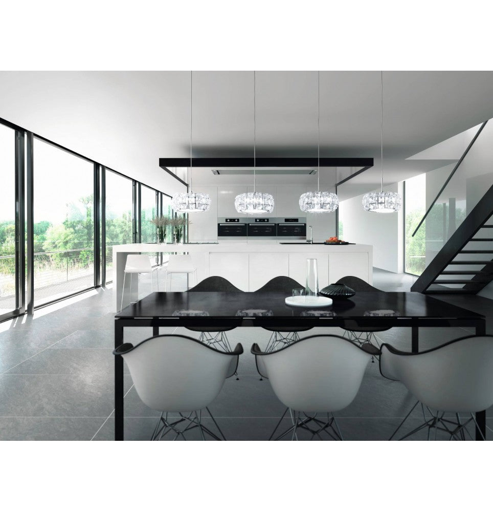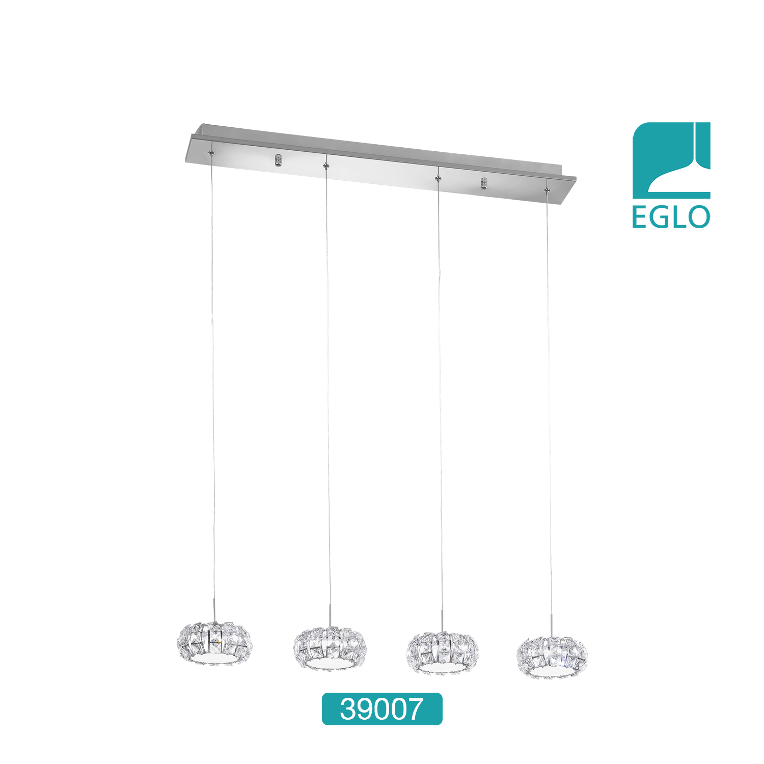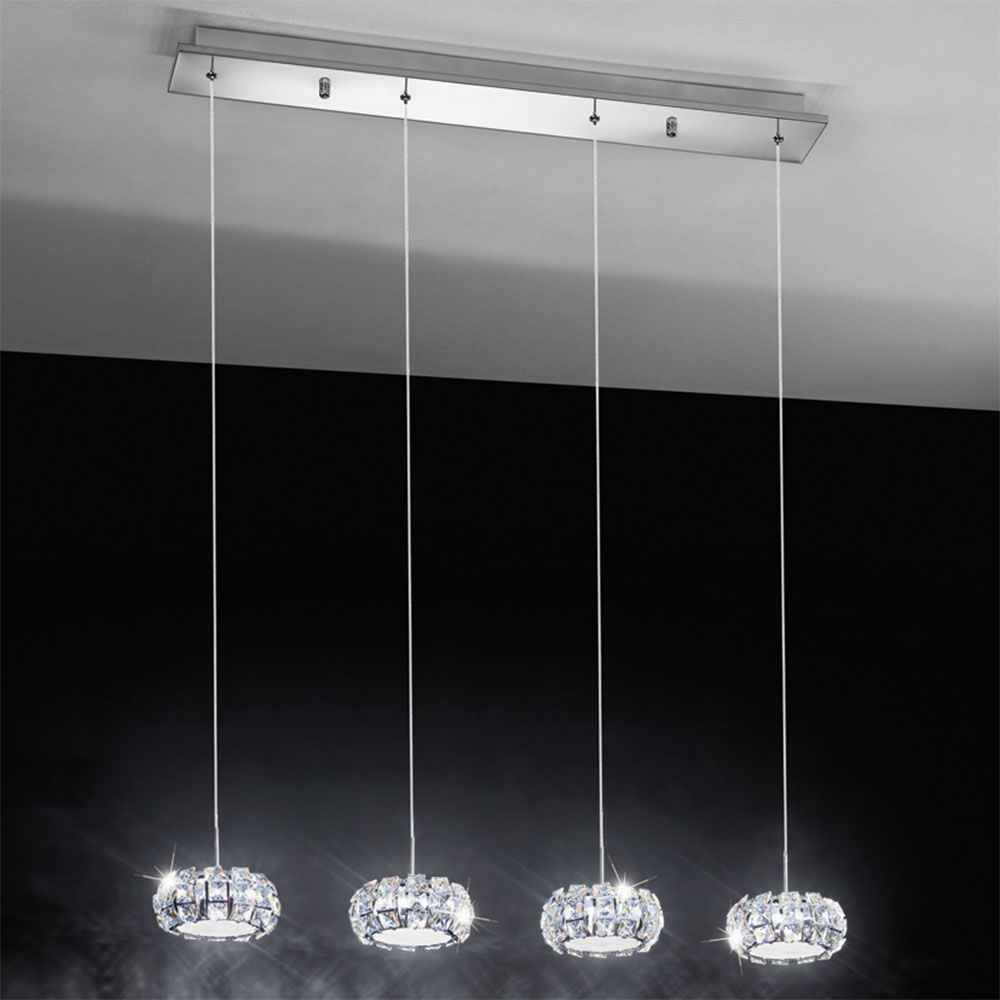 Stylish and modern led pendant lamp, made of chrome metal base with four transparent glass crystal shades. Lamp suitable for your living room, dining room, bedroom, hotel and restaurant.