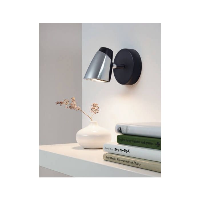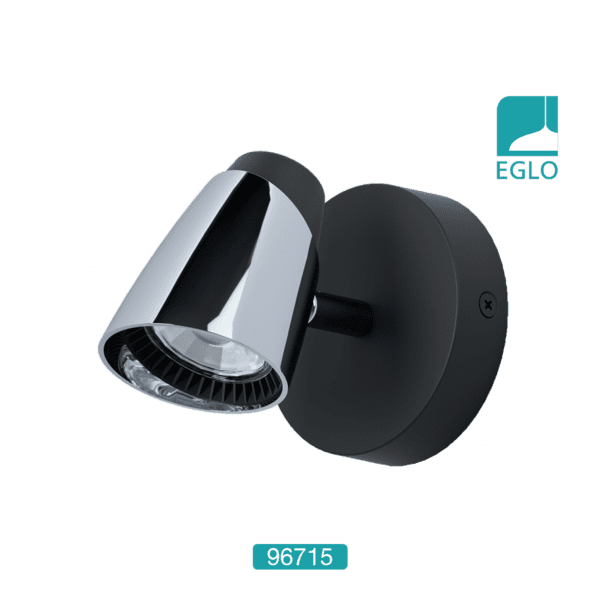 EGLO Spotlight for indoor. And this MONCALVIO is made of black and chromed steel. It equip with an LED bulb, which provides warm white light.