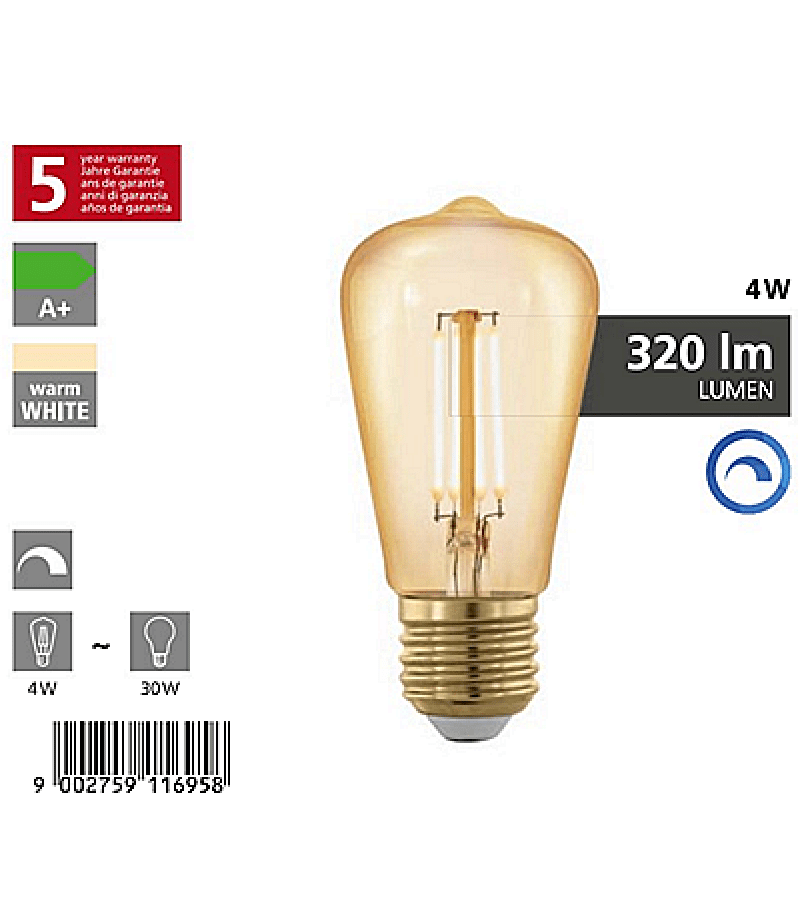 EGLO 11695 LED 4W Squirrel ST48 E27 ES Golden Dimmable Lamp 320lm 1700k