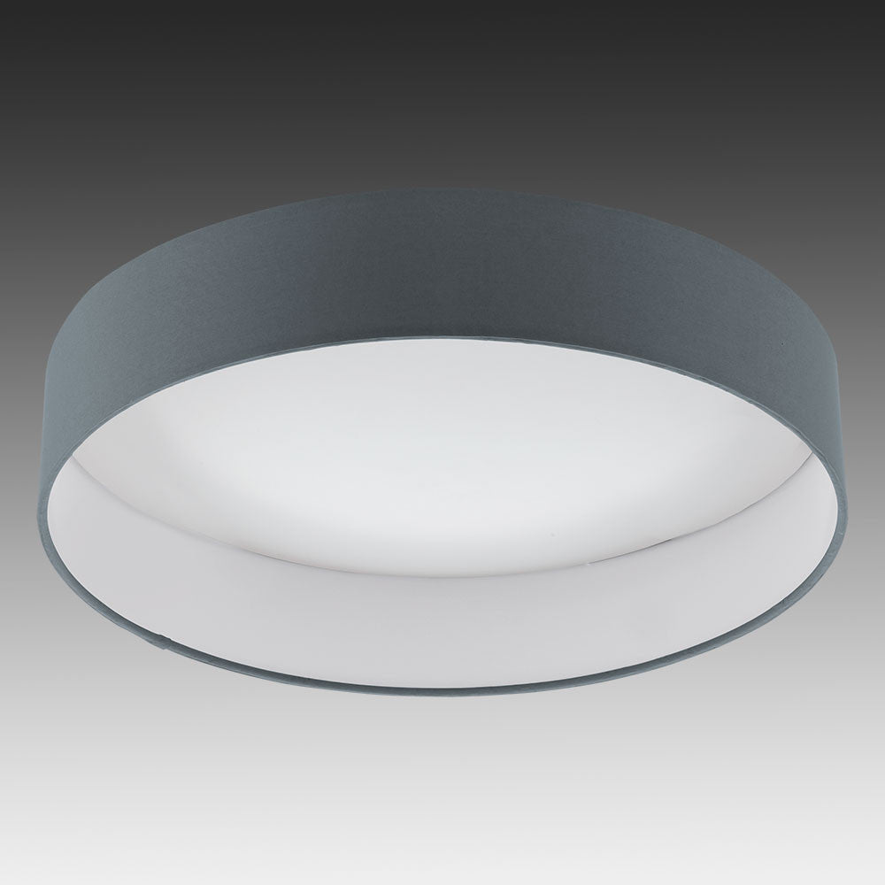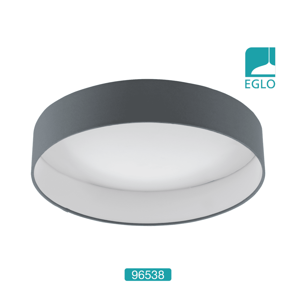 Eglo 96538 Palomaro 1 LED Flush Ceiling Light In Anthracite Fabric. The LEDÂ flush ceiling light in anthracite fabric and is available in different sizes. This one has a diameter of 405mm (please see website). Then there is indirect illumination with this light making it a convenient lighting effect for any room.