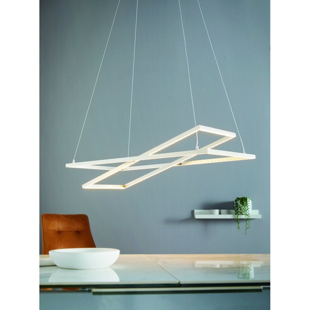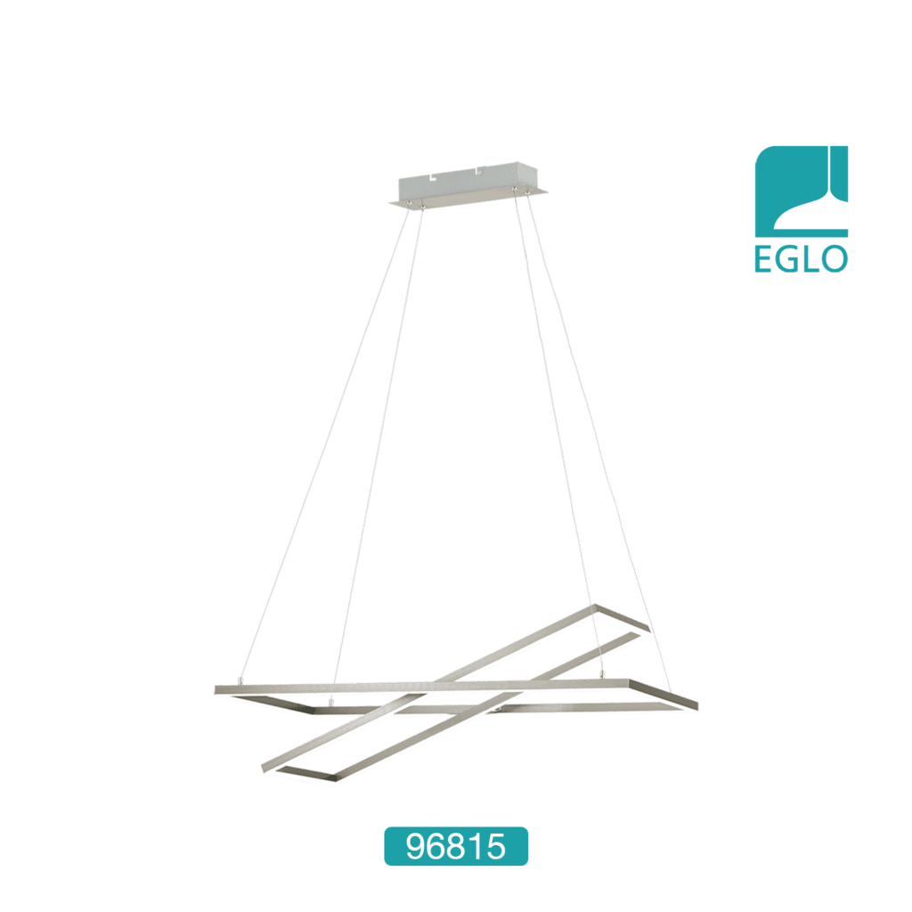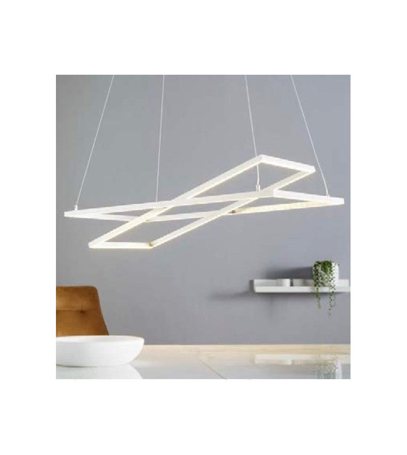 Original LED pendant lamp, made of steel base with two rectangular steel bodies in satin nickel colour and white plastic diffusers. Hanging lamp with stylish design that will give a modern atmosphere and excellent light to your living room, dining room, restaurant or hotel.