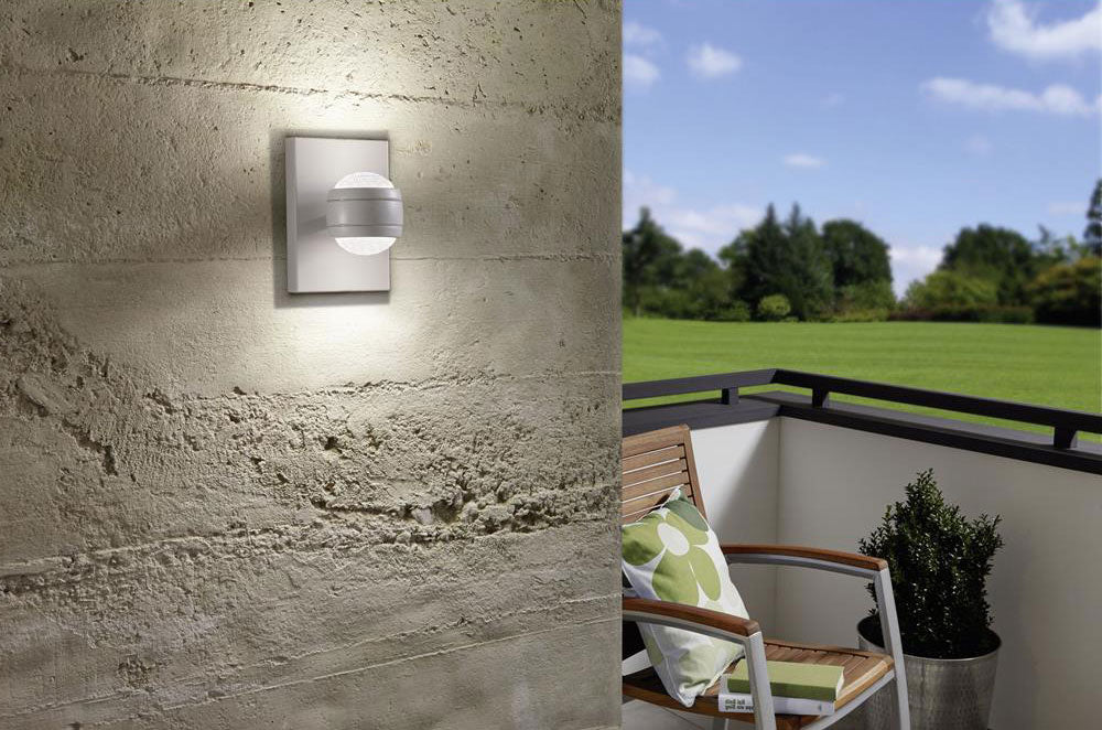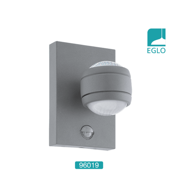 Original LED facade wall lamp made of silver galvanized steel body with clear plastic diffuser with motion sensor and day and night sensor. Modern solution for lighting the facade of your home, patio or porch.