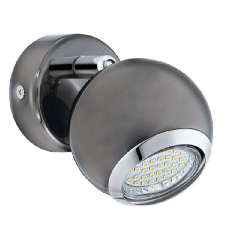 Eglo Lighting Bimeda single light LED spotlight wall fitting features a circular design wall plate in black nickel finish holding a round ‘eyeball’ shaped spotlight in with polished chrome finish edging.