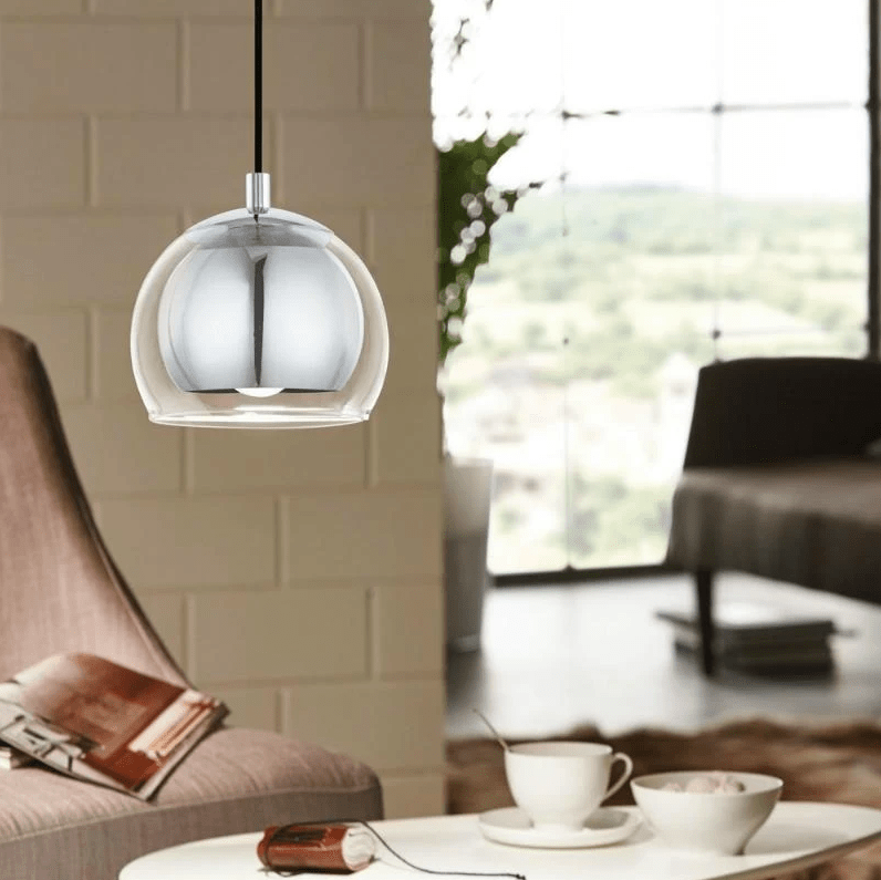 This Eglo Rocamar one light ceiling pendant light is finished in chrome and comes complete with a clear glass shade. The clear glass shade surrounds the chrome inner. So this modern light would look stunning in any room. Â