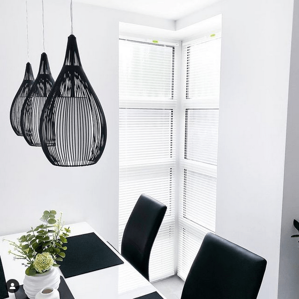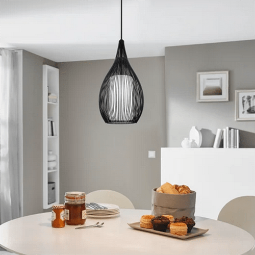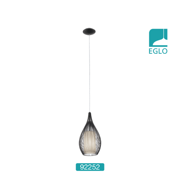 This Eglo Razoni one light ceiling pendant light is finished in black and suspend on a white cable from a ceiling plate. The teardrop style shade is a cage design and there is a white inner cylinder concealing the bulb. So this stunning light is unusual in appearance and would make a striking addition to any room.