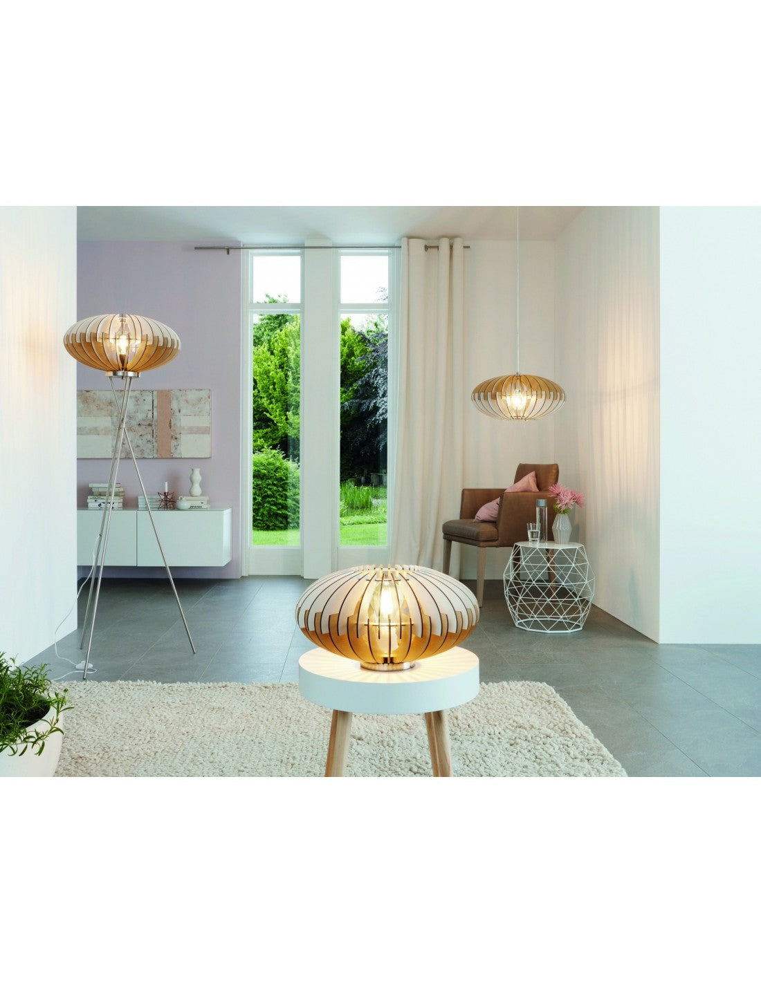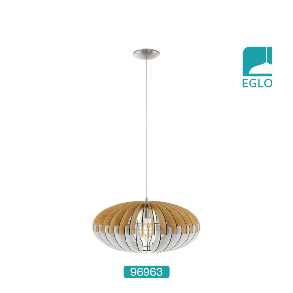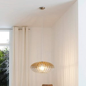Modern pendant lamp with original design made of satin nickel steel base and spherical wooden shade in natural and white colour, suitable for the interior lighting of your stylish living room, dining room, bedroom, hotel or restaurant.