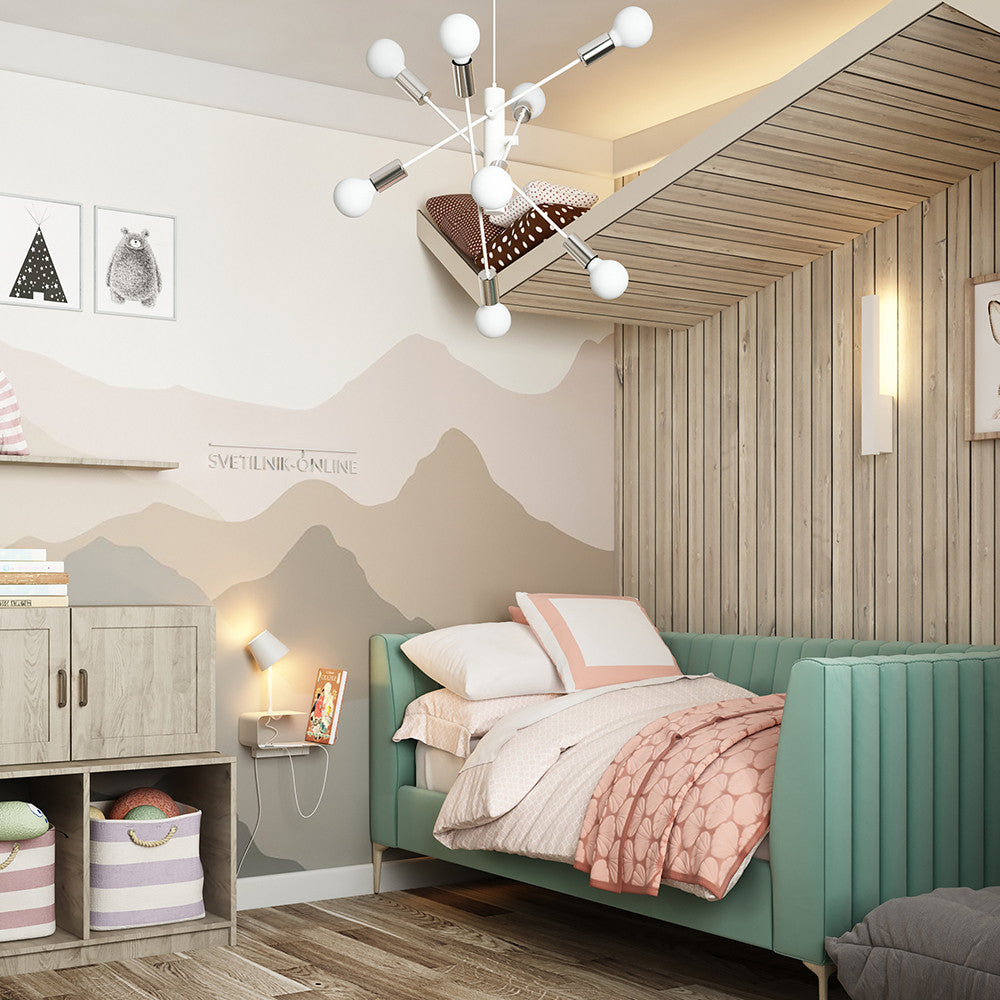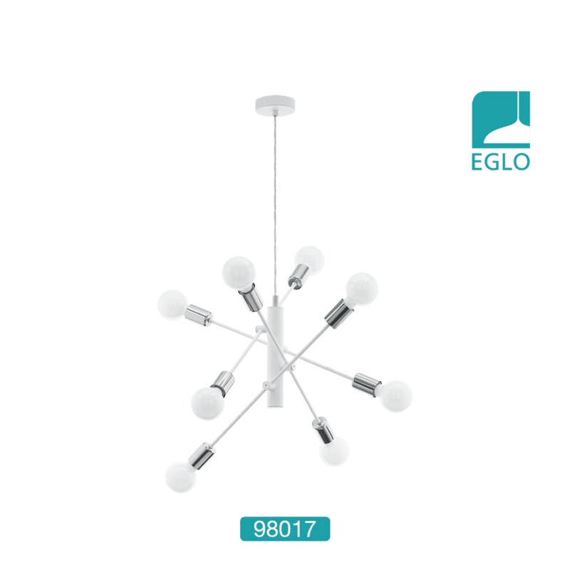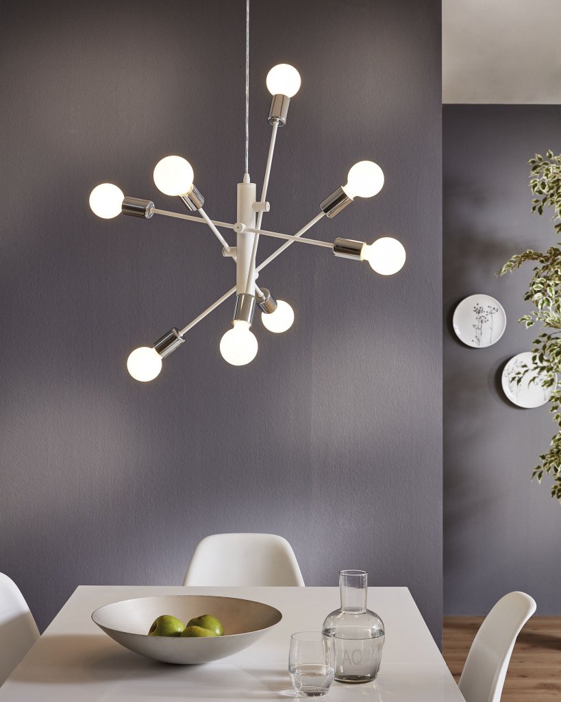 This Eglo Gradoli eight light atomic sputnik ceiling pendant light is finished in chrome. Suspended on a wire, this light is an explosion of bulbs in all different directions and angles. It would make an impressive addition to any modern or contemporary room.