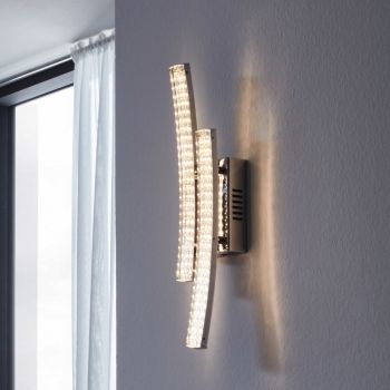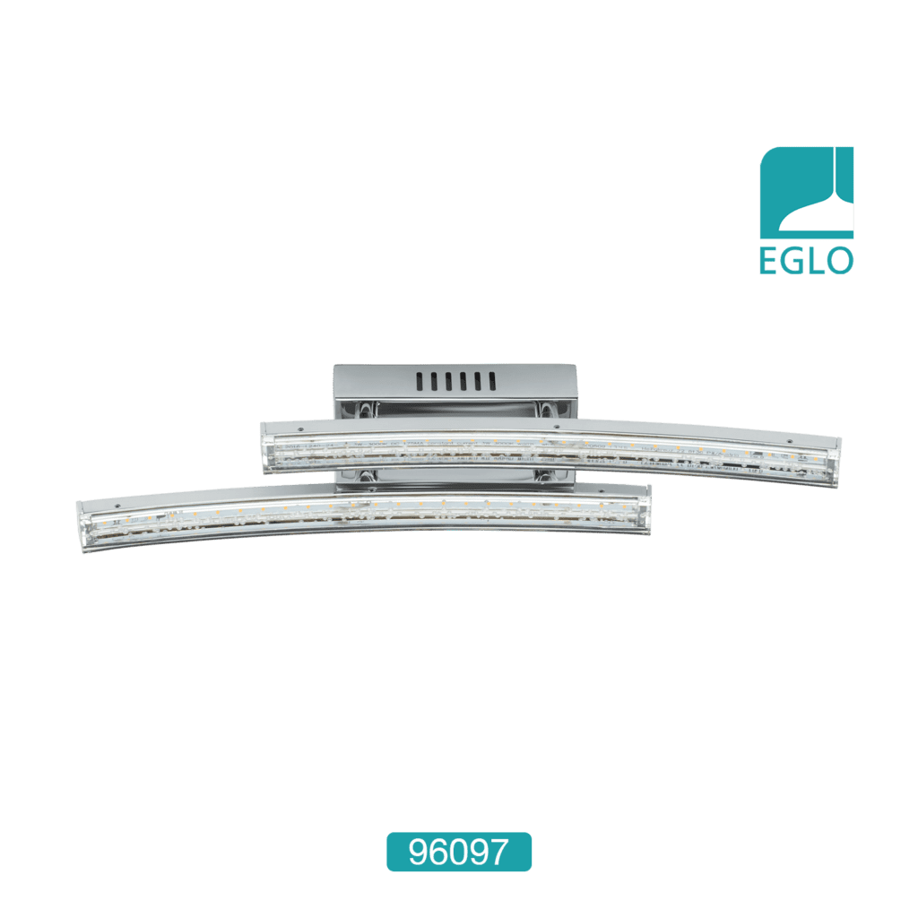 Eglo 96097 Pertini Two Light LED Wall Light In Chrome. This curved light has the LED bars, covered in transparent plastic, running in parrallel at different heights. So it’s offering a warm glow when illuminated and making it a stunning addition to any room.