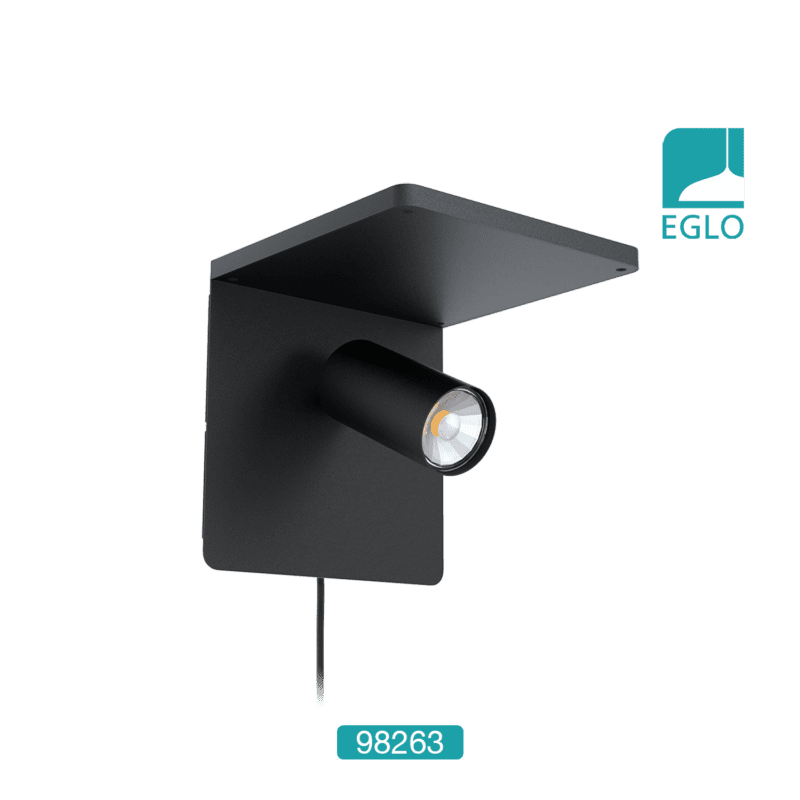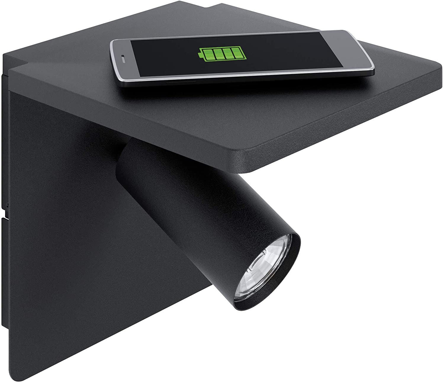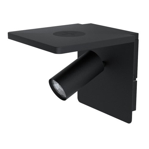 This Eglo Ciglie one light LED wall light is finished in black and has a Qi Charger which can be used to charge Qi-compatible smartphones wirelessly by inductive energy transfer. The light is below a shelf upon which items can be placed. It would look great in any modern environment.