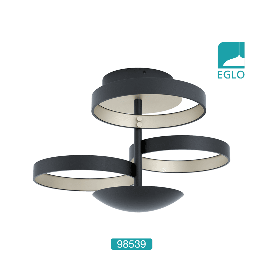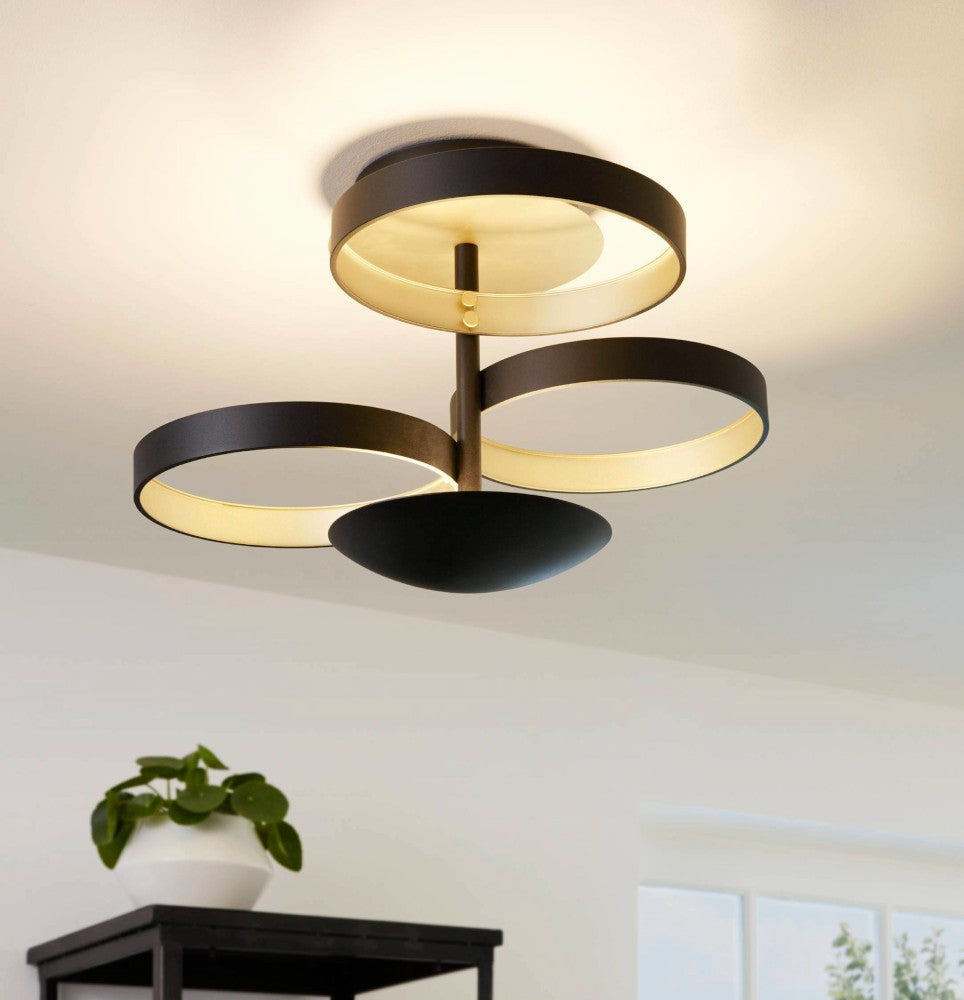 This Eglo Gromola semi flush LED ceiling light is finished in black and champagne. Each of the three rings have gold insides which reflect the light beautifully when illuminated with the lower dome adding the finishing touch.