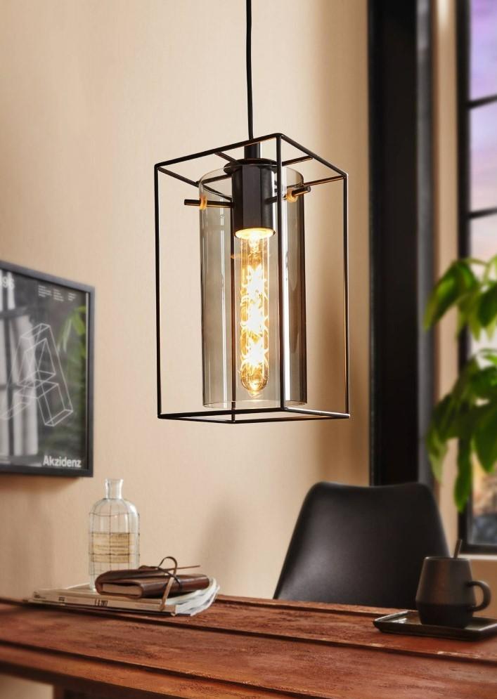 This Single Pendant Light from the series LONCINO is made of black steel and black-transparent smoked glass. It has protective insulation and needs an E27-lamp to shine.
