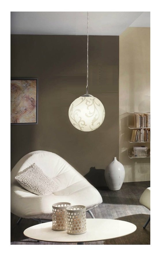Stylish pendant lamp in spherical shape, made of plastic, steel and white glass with decoration. A quality lighting suitable for your home, hotel or restaurant.
