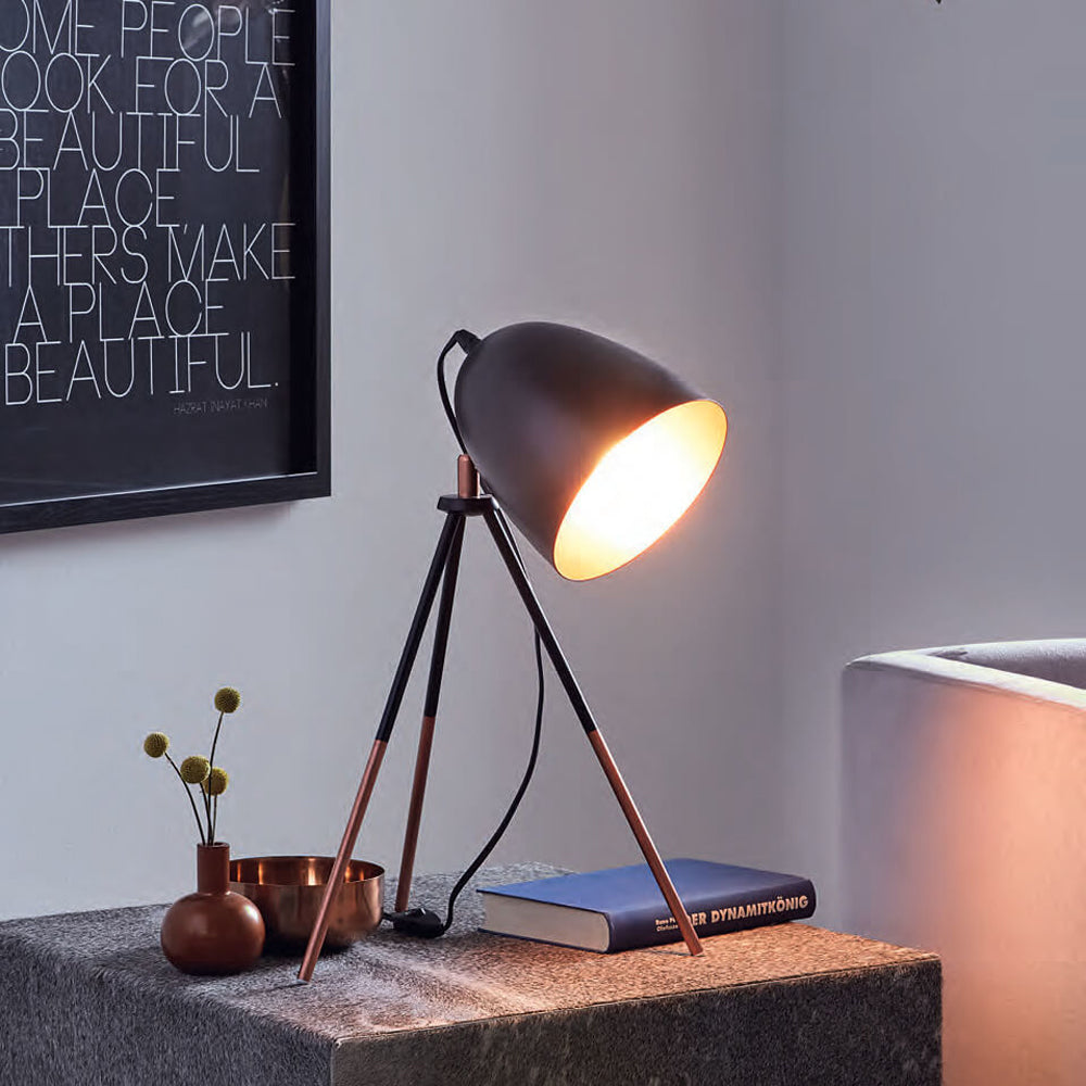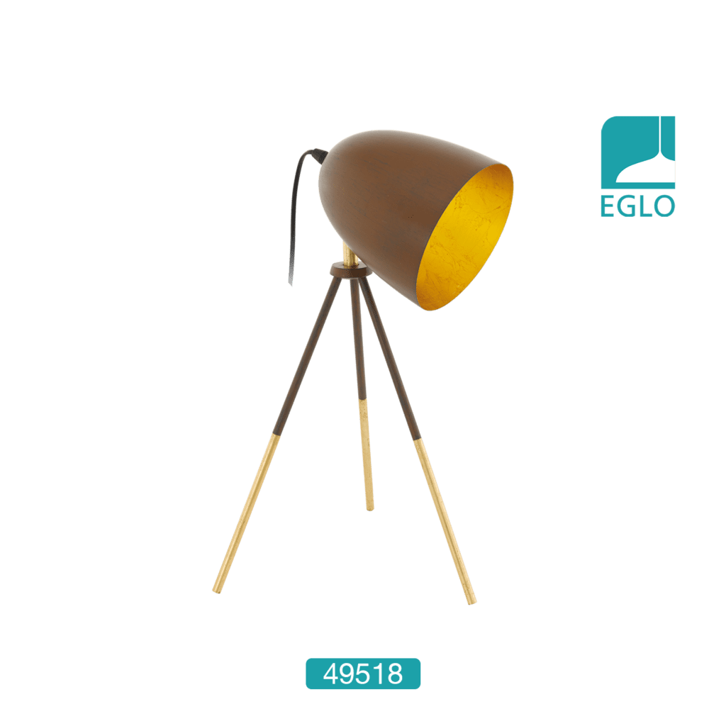 Original table lamp in vintage style, made of three steel legs with oval steel shade in rust-colored outside and golden inside. Therefore modern addition to the interior lighting of your living room, dining room, bedroom, office, hotel or restaurant.