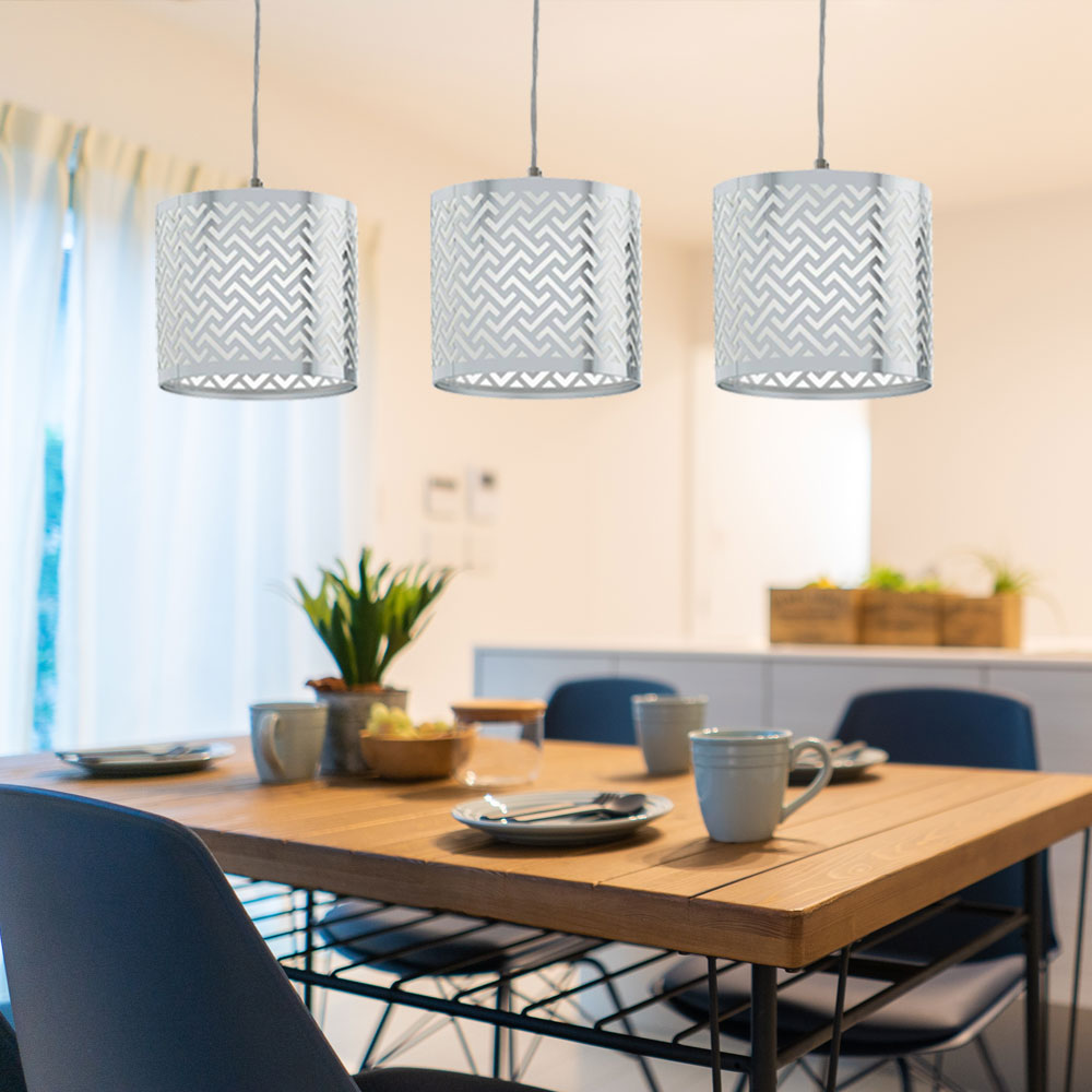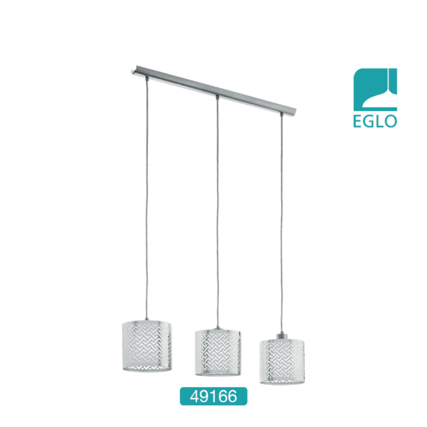 This EGLO Leamington 1 three light ceiling bar light is finished in nickel and chrome. The beautiful shades have cut out detailing, which offers a wonderful lighting effect when illuminated. It would make a striking addition to any room in particular over a breakfast bar or dining table.