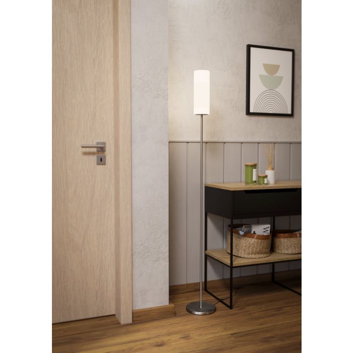 The TROY 3 floor lamp features a metal base in a matte nickel finish and a cylindrical lampshade made of white satin glass. The floor lamp switches on and off easily using the in-line floor switch. With its simple design, the floor lamp works well with almost any interior style and creates cosy lighting in any space, whether in the living room, bedroom or dining room. The product has an E27 lamp holder and requires 1 x E27 lightbulb, which is not included.