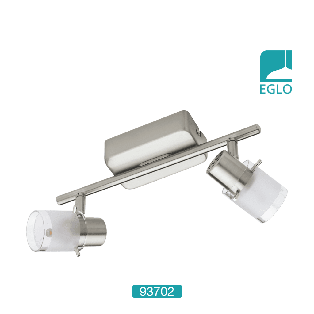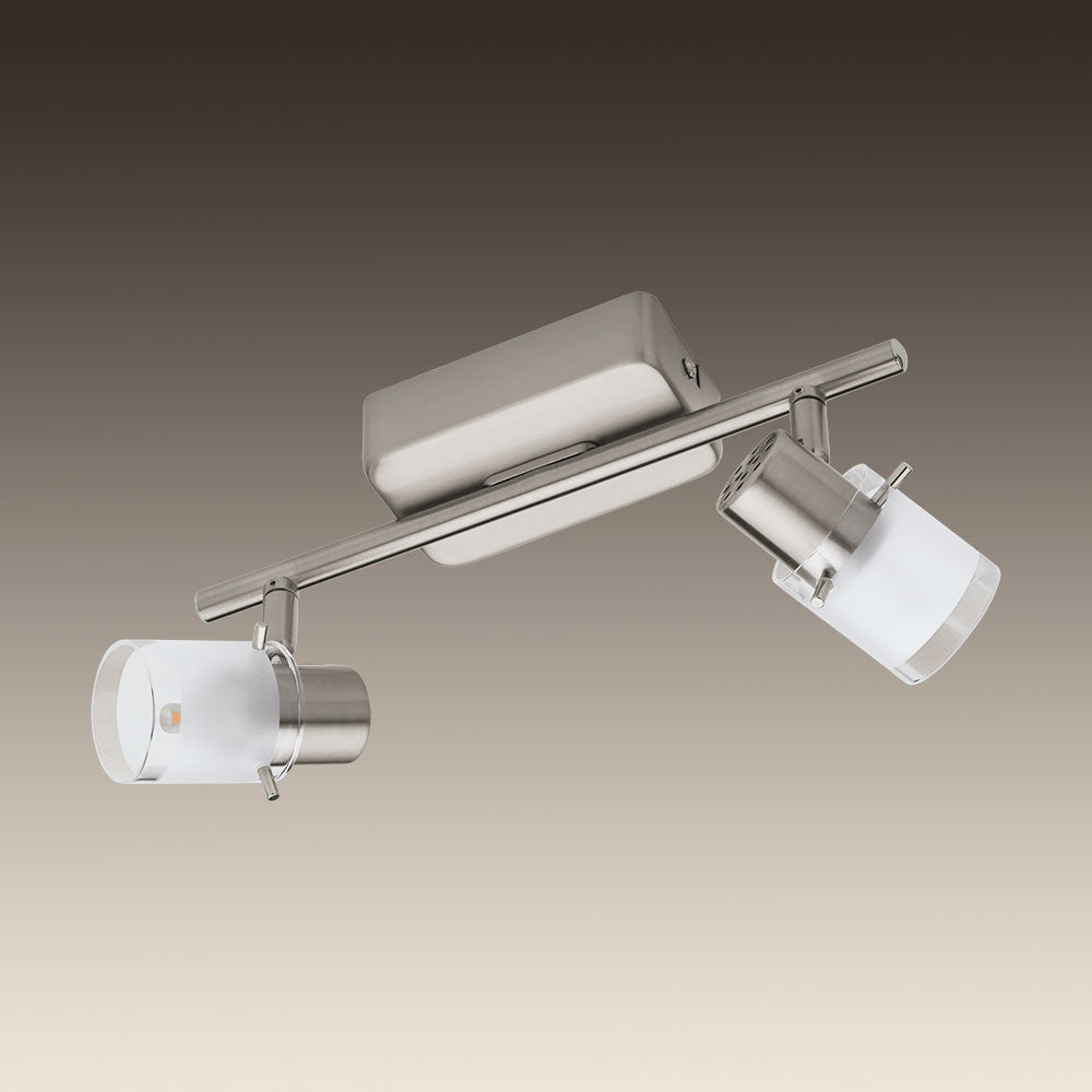 Eglo 93702 Orvieto 1 Two Light Ceiling Spotlight In Satin Nickel. It has adjustable heads allowing the user to direct the light as required. The lights come complete with white and clear glass shades which finish the light off beautifully. It would make a stunning addition to any room