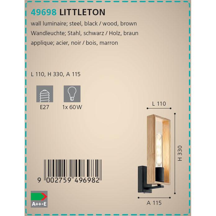 Vintage Wall Light of the LITTLETON series is made of brown wood and black steel. An E27-illuminant is needed to shine. Socket Type : E27 Max Wattage : 1x60W Length (mm) : 110 Height (mm) : 330 Weight (kg) : 0.711