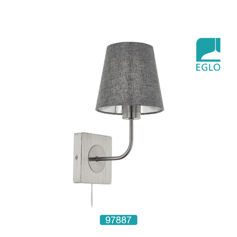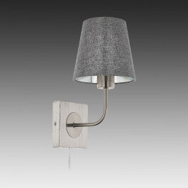 This EGLO Pausia one light wall light is finished in satin nickel and comes complete with a grey linen shade. The wall plate has a curved arm which supports the shade making it a stunning addition to any room.